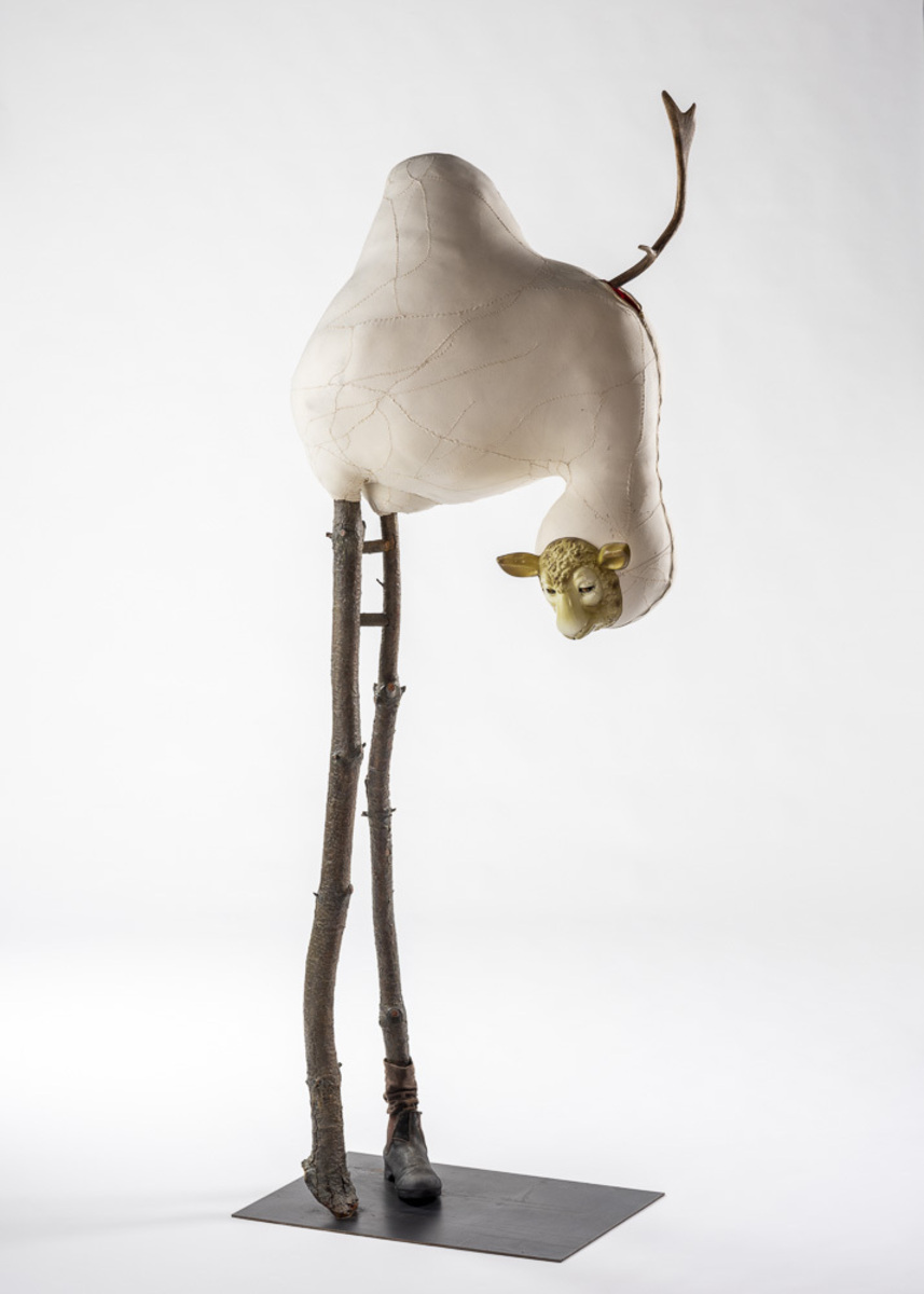 Timber, pine tree branches, calico, velvet, antler, stuffing, zip, found objects