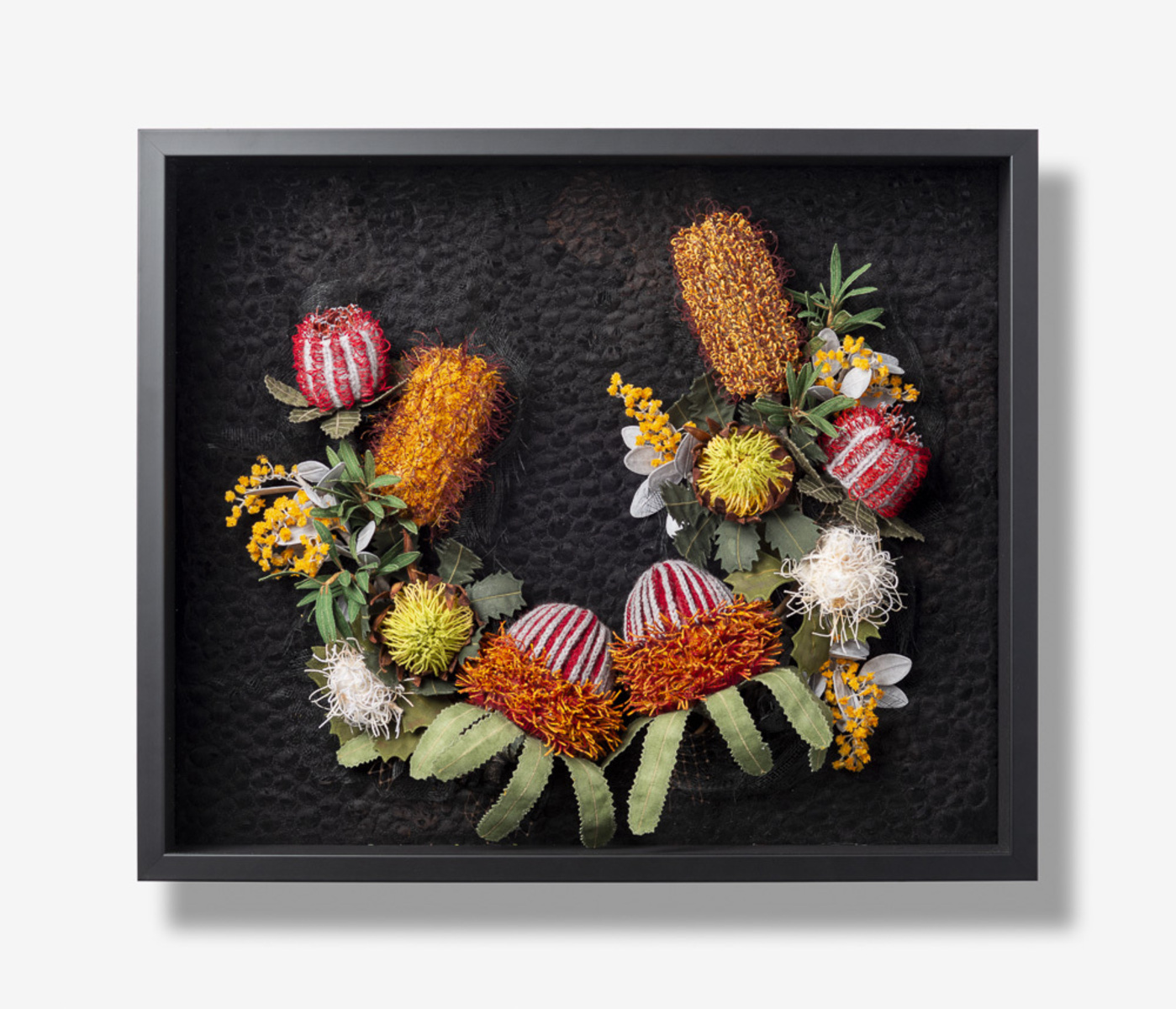 Wool, cotton, polyester, felt, organza, DMC cottons, and wire