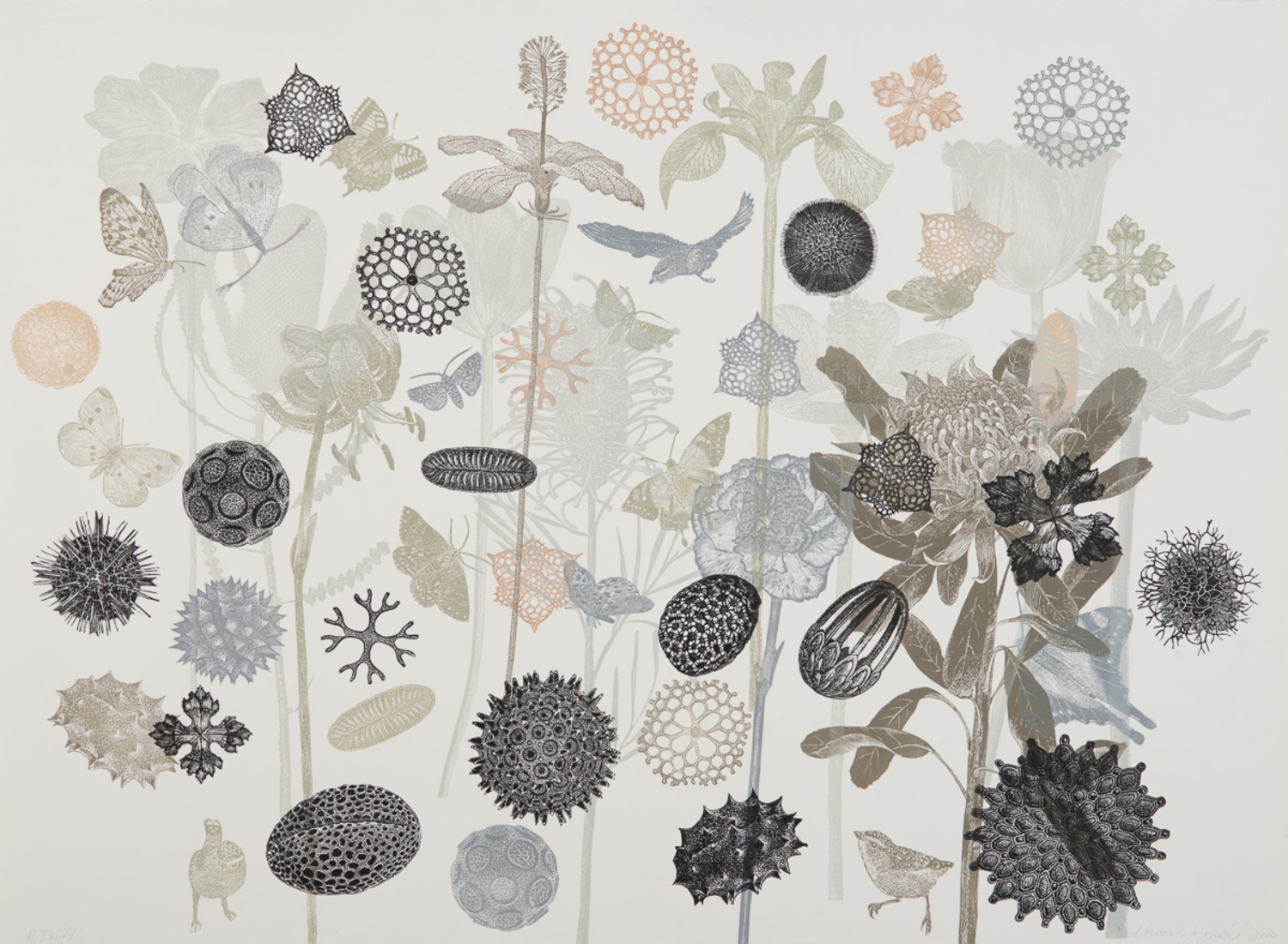 Linocut prints, burn drawings, image transfer, and pigmented ink on mulberry paper