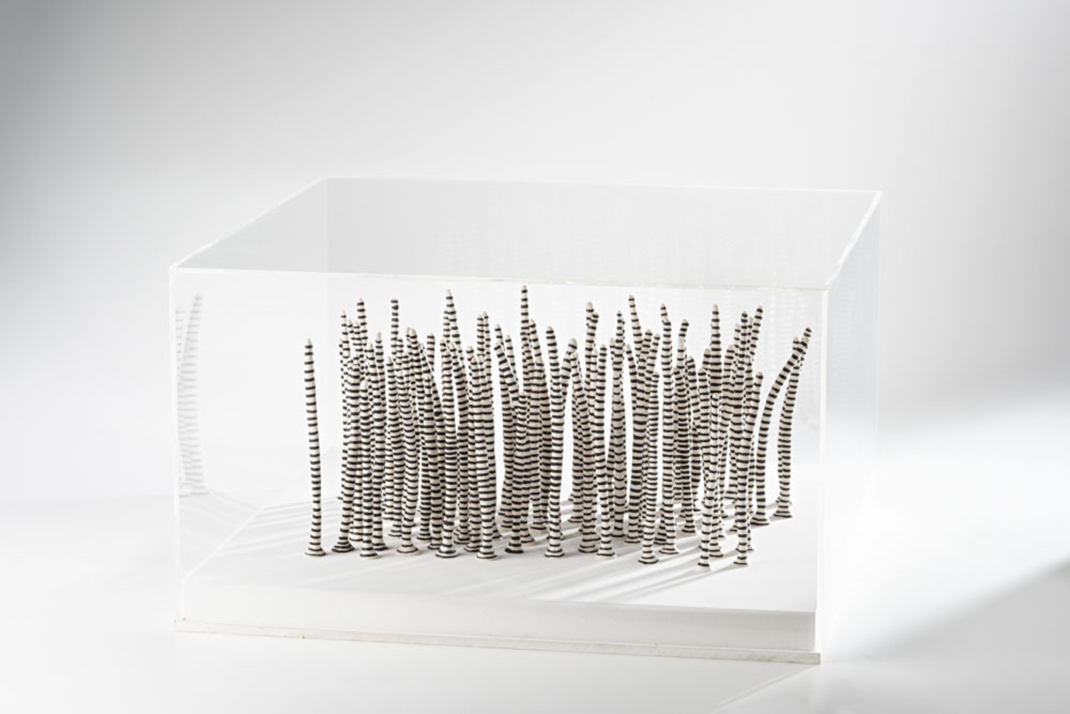Modelling material, acrylic and enamel paint, MDF, Perspex box